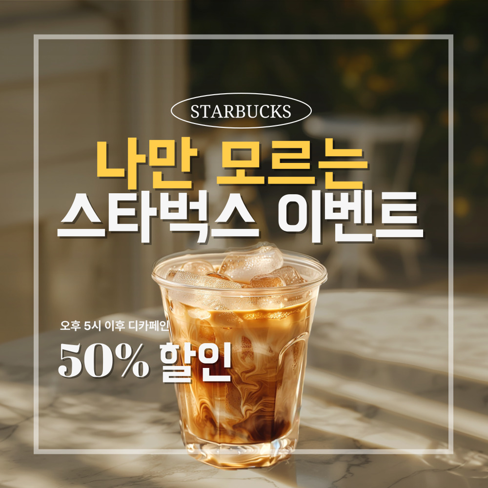 스타벅스는 매일 오후 5시 이후에 디카페인 커피와 카페인 프리 음료를 구매하는 고객에게 최대 50% 할인 혜택을 제공하는 이벤트를 진행 중이에요.